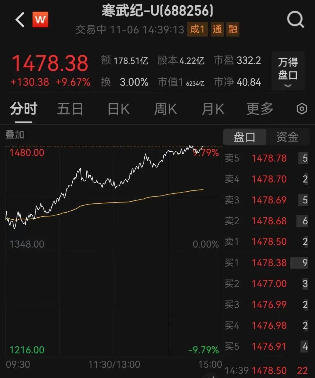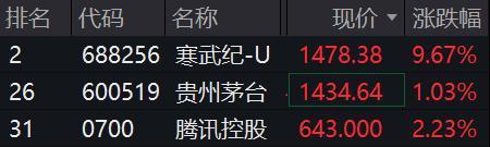 截至发稿,寒武纪-U涨9.67%,报1478.38元;贵州茅台涨1.03%,报1434.64元。